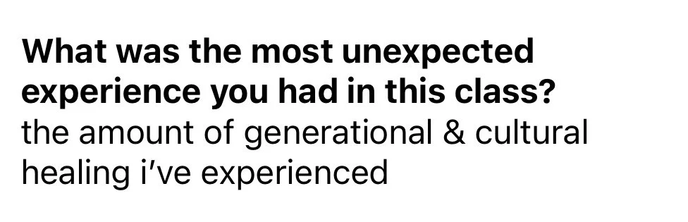 “Thank you for being transparent, vulnerable & REAL!!! you are a delight and it has been an honor to learn from you! So many moments of expansion, but learning how it feels to bump up against matched energy was definitely a big ah ha moment. Recognizing energy that isn’t mine and being able to back up, detach, and understand the sensation or nudge to know how to better hold space for myself and others is an amazing feeling. Especially when it’s related to generational & cultural healing. Knowing how to safely hold space for myself while holding space for others while healing my own person has been amazing tool”